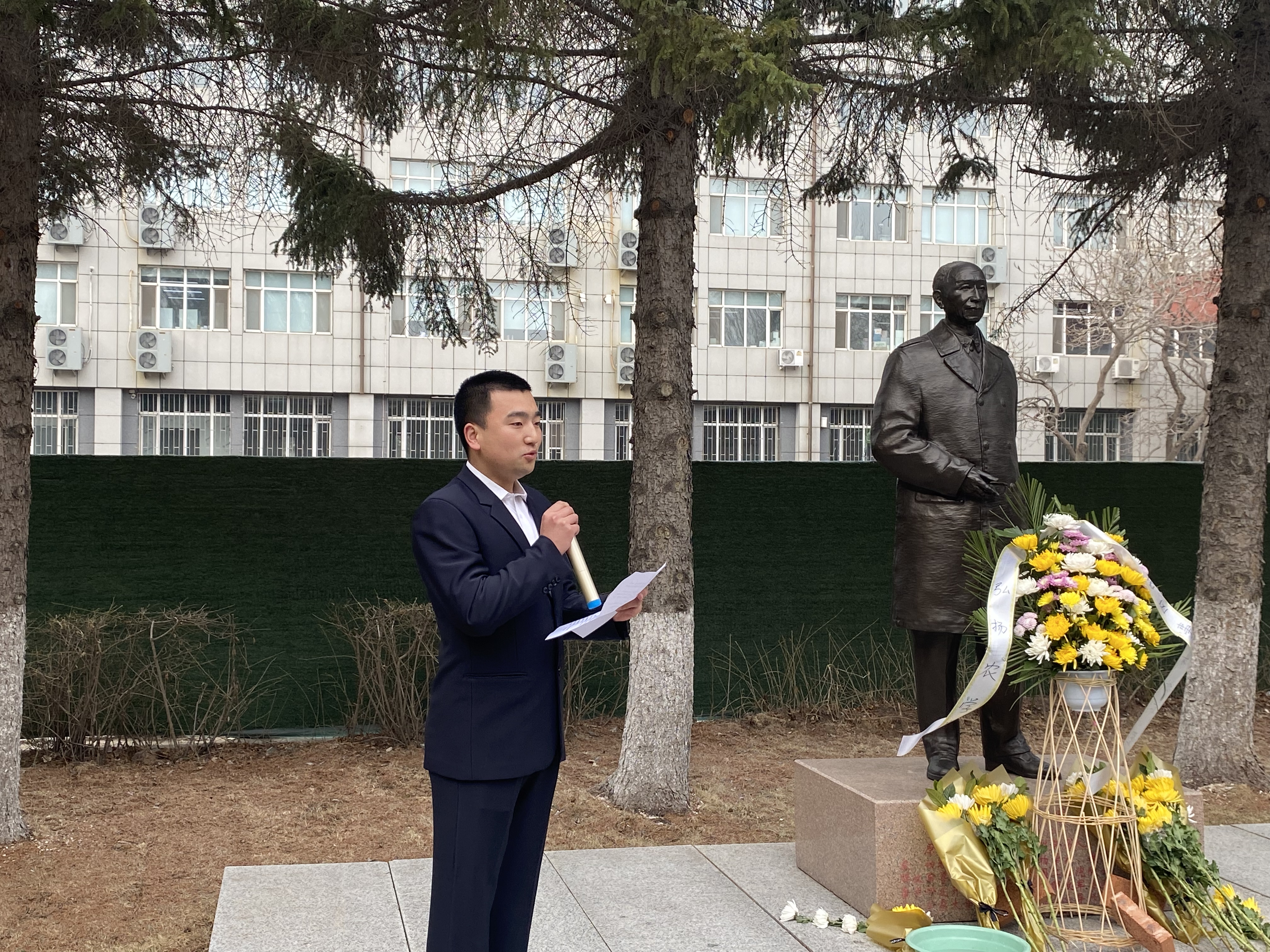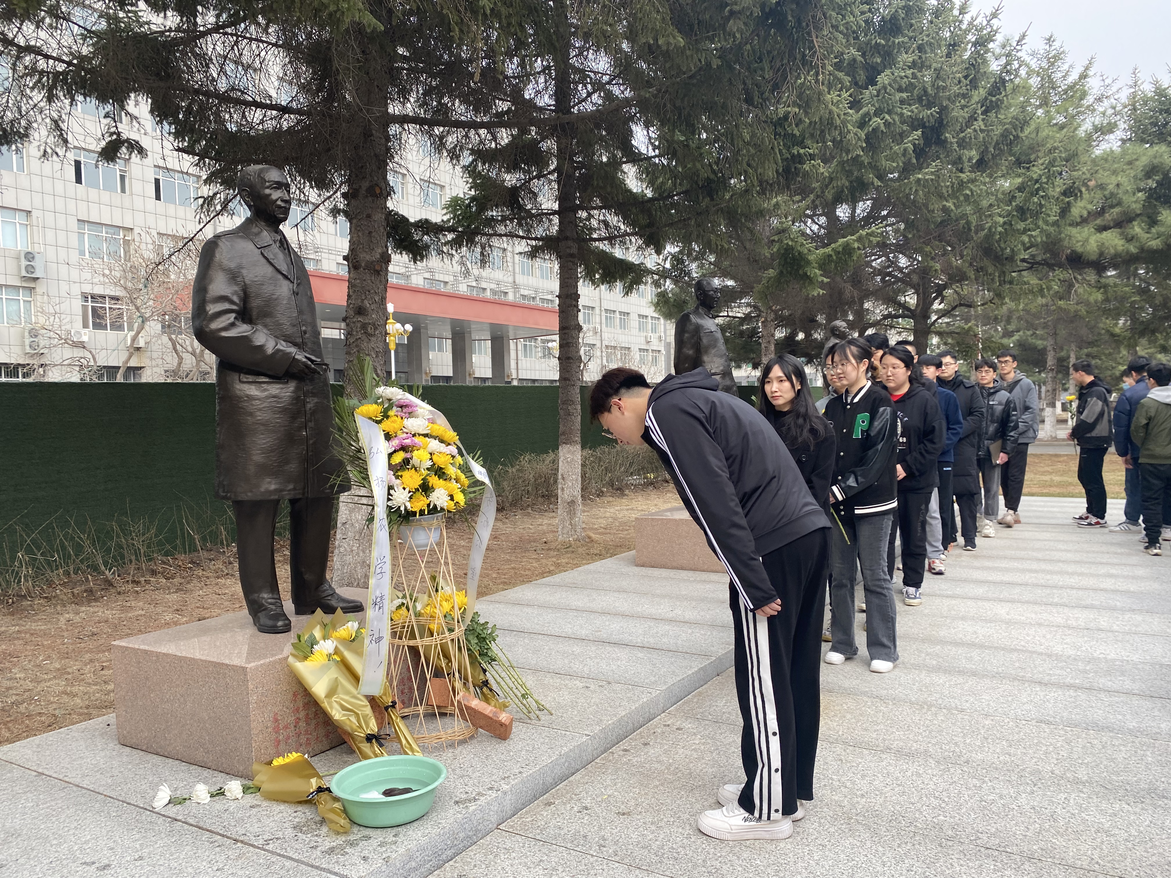 碧空如洗,松柏苍翠,庄严肃穆,先贤铜像巍峨耸立。在慷慨激昂的国歌声中,在场师生身着黑色衣服肃立,深切缅怀EMC易倍平台“徐华清、任抟九、殷震”三位先贤,感念先贤付出,追慕先贤精神,赓续先贤力量。到场师生在先贤铜像前依次敬献鲜花并默哀一分钟。员工代表分别为三位先贤擦拭铜像,以此表达对先贤的敬仰和哀思。
