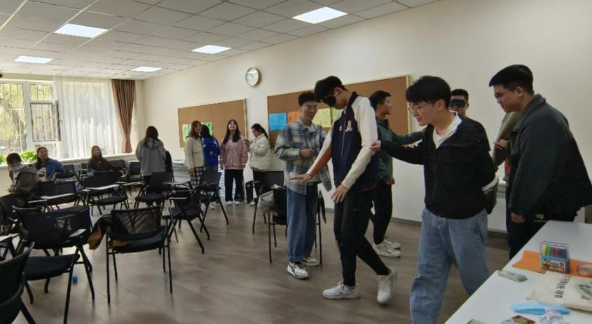 接下来是激动人心的“信任之旅”。在这个过程中,同学们两人为一组,分别扮演“盲人”和“引路人”,在不允许语言交流的前提下,“引路人”利用肢体语言引导“盲人”按照指定路线行走、转弯,跨过一个个障碍,走完遍布障碍的长长“盲道”。在这个充满挑战的游戏中,一颗颗信任的种子就此播下,同学们在学会了信任他人的同时,也领会到了被信任的喜悦心情。