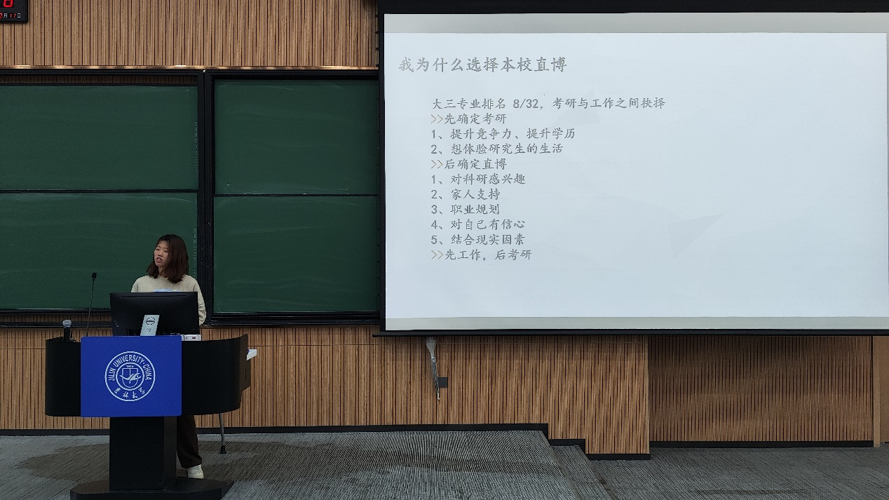随后钱喜静从专业学习、英语学习、科研入门、学科竞赛四个方面为同学们本科四年的学习方法、努力方向进行了一定指导,提醒同学们要注意专业课学习的中的重点以及定时反馈调整,并在学科竞赛方面提出了有价值的参考建议。除此之外,童新东简单地区分了几种保研的类型,分享了自己在夏令营投递、面试的经验,强调了英语学习的重要性。二人均就保研的前期准备做了细致分享:成绩绩点是关键,科研竞赛是锦上添花。