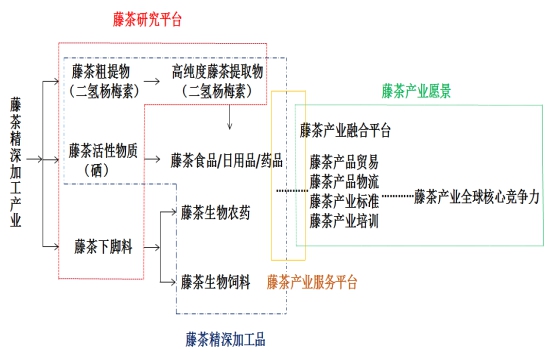 藤茶,又叫显齿蛇葡萄, 其主要成份为双氢杨梅树皮素,并含少量杨梅素。药理实验表明,藤茶有祛痰止咳、降血脂和保肝等作用。杨梅素有抗菌、抗癌、止咳、祛痰、利尿等作用。藤茶叶经国家卫生计生委食品安全标准与监测评估司认定,可做食品加工原料。根据藤茶产业的发展需求,主要开展藤茶资源基因组分析和新品种选育, 藤茶不同部位化学成分全方位分析以及活性成分再挖掘, 基于藤茶以及藤茶功能成分(二氢杨梅素、糖苷,多肽, 木脂素, 硒等)的精深提取, 二次加工利用、高附加值新食品原料,功能抹茶研发及藤茶下脚料多次利用(功能饲料,日化用品)等关键技术研发与成果转化应用。