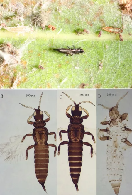 ▲圆率管蓟马危害状与形态