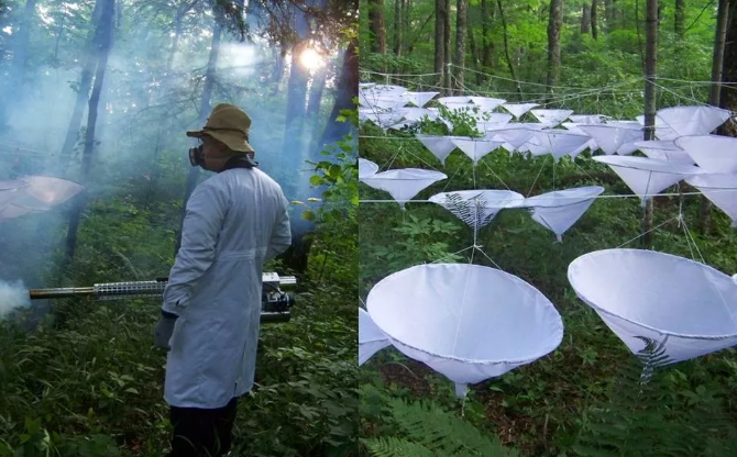 ▲王军指导硕士生崔彦泽采集林冠蓟马