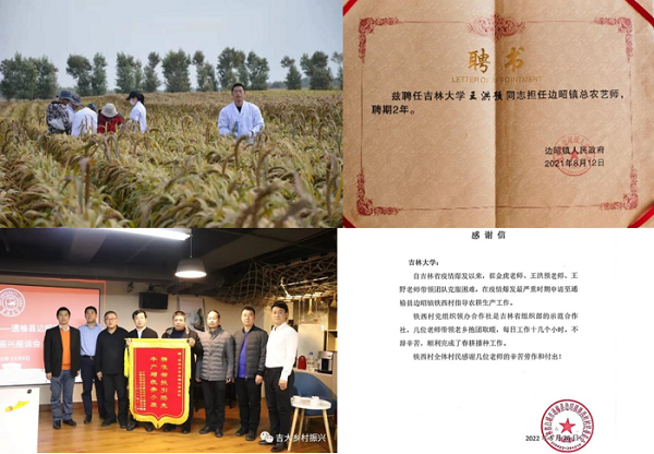 除了教学和科研任务,王洪预同志积极参与EMC易倍平台定点帮扶工作。2017年11月起,作为EMC易倍平台科技扶贫小分队骨干成员,参加了通榆县边昭镇科技扶贫工作,每年生产季节到田间地头进行现场指导。四年来,参与通榆县与边昭镇农技人员培训10期,共培训1000余人次,生产一线也成了技术指导的课堂。2018-2021年间,通榆县的谷子平均增产43.1%,高粱平均增产36.4%,花生平均增产22.6%,玉米平均增产50%以上,创造了当地粮食生产的新纪录,为通榆县打赢脱贫攻坚战,为当地乡村振兴工作作出了重要贡献;2021年主持“基于玉米-鹅为载体的种养结合、节本增效生产技术示范推广项目”,实现了“依靠科技种好1公顷地增收4000元”的目标,同年,被通榆县边昭镇聘为总农艺师。