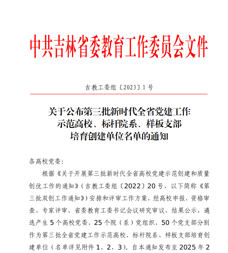 近日,吉林省委教育工委下发了《关于公布第三批新时代全省党建工作示范高校、标杆院系、样板支部培育创建单位名单的通知》,公司党委获批“全省党建工作标杆院系”培育创建单位。
