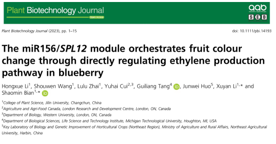 2023年10月5日,EMC易倍平台边少敏教授团队在Plant Biotechnology Journal(IF 13.8)上发表了题为“The miR156/SPL12 module orchestrates fruit colour change through directly regulating ethylene production pathway in blueberry”的研究论文,首次证实miR156/SPL12可以直接抑制乙烯合成的关键酶基因VcACS1(ACC SYNTHETASE1)和VcACO6(ACC OXIDASE6)的表达从而抑制蓝莓中的乙烯合成,并进一步影响果实成熟过程中叶绿素的降解与花青苷的积累。该研究为植物中miR156/SPL介导的调节与乙烯信号途径之间的联系提供了新的见解。