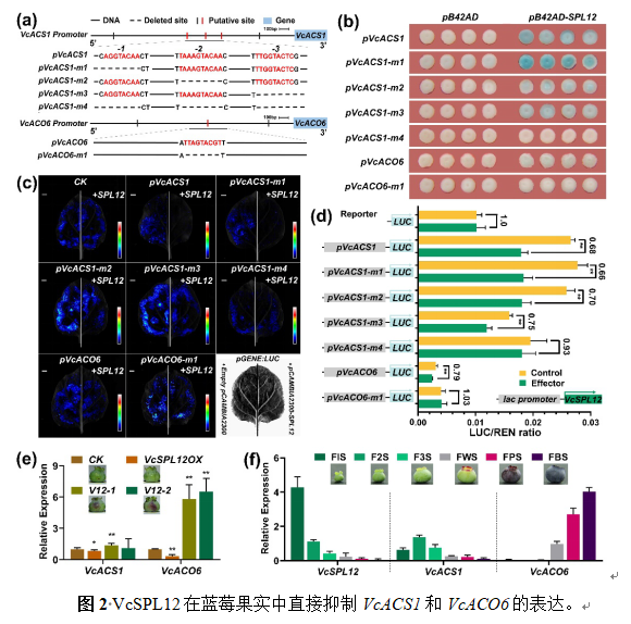 为了进一步探索VcSPL12与乙烯信号之间的关系,通过酵母单杂交、Dual-Luc等实验证实,VcSPL12可以直接结合在乙烯合成关键酶基因VcACS1和VcACO6的启动子上并抑制这两个基因的转录。VcSPL12在蓝莓果实中瞬时过表达和VIGS后,VcACS1和VcACO6的表达发生相应的变化(图2)。此外,VcSPL12还可以直接结合到叶绿素合成相关基因VcDVR的启动子,从而正调控该基因的表达,直接促进果实中叶绿素的合成。
