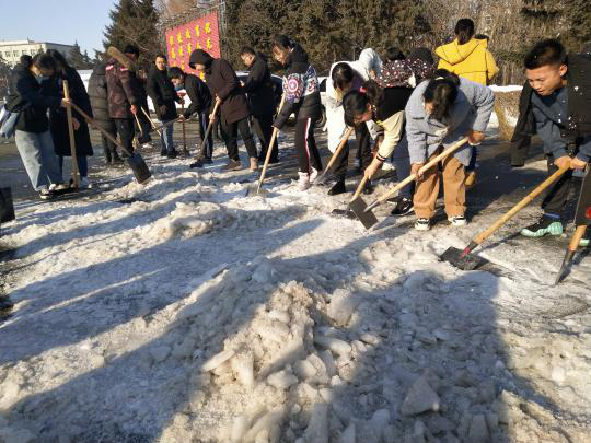 在凛冽的寒风中,党员和积极分子们不惧严寒,挥舞着手中的铲子和铁锹,开始了辛勤的劳动。他们先用锋利的铲子将厚达4、5厘米的坚冰一点点地敲碎,再用铁锹和扫帚等工具将碎冰清理干净。在这个寒冷的冬日,他们互相配合,一同劳动的身影为每一个人的内心都带去了温暖,也为我们的校园增添了一份温情。