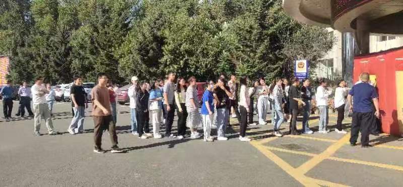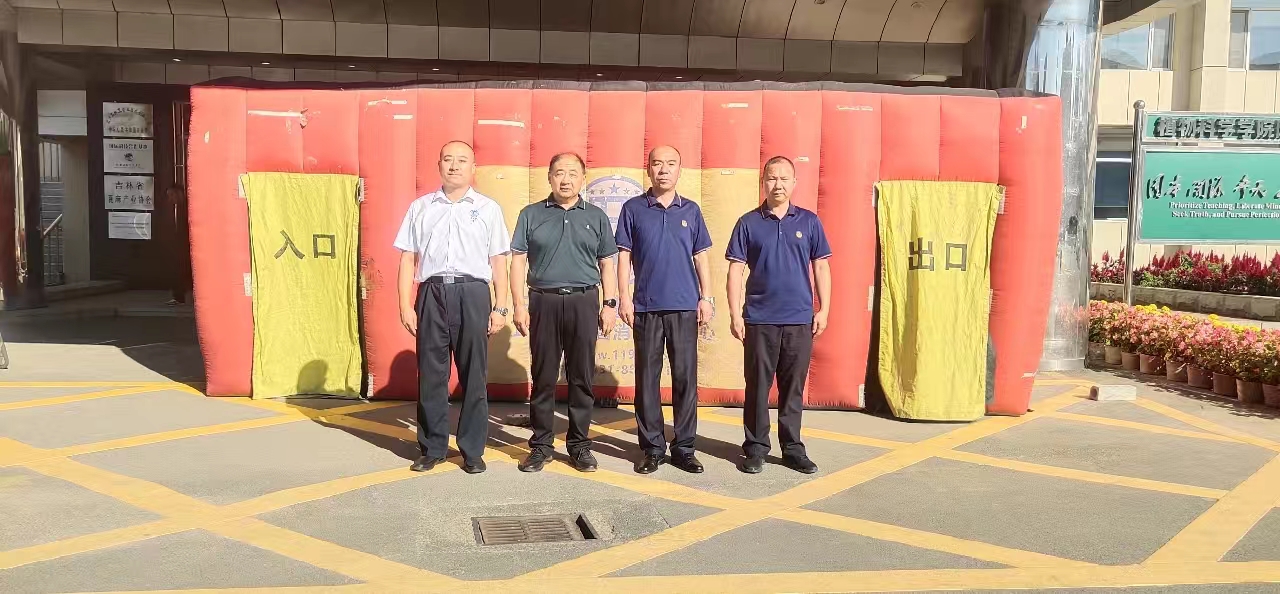 讲座结束后,全体师生来到公司楼前三环广场进行提前准备好的气垫房实景逃生演练,两或三人一组进行,要求在二十秒内从出口安全逃出。