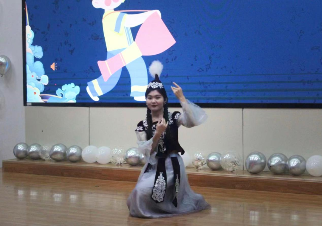 活动在哈萨克民族独舞《黑走马》中正式拉开序幕,阿依波塔踩着节拍婆娑起舞。悠悠冉冉的歌曲,配上流畅自然的舞蹈,为观众带来了一场视听盛宴。紧接着就是妙趣横生的少数民族语言教学,同学们在学习到苗族和彝族语言的同时,感受到中华语言文字的博大精深,也对中华民族不同文化交流互鉴优秀成果有了新的认识。